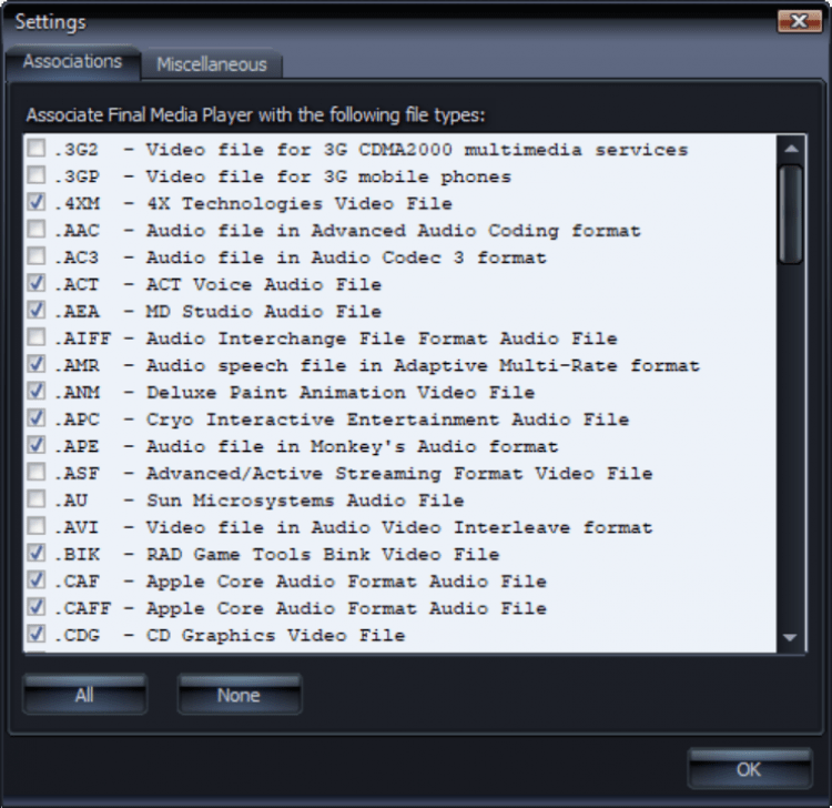 - Аудио: AAC, AC3, ACT, AEA, AIFF, AMR, APC, APE, AU, CAF, CAFF, DTS, EAC3, FLAC, GSM, H261, H263, H264, IRCAM, M4A, MKA, MLP, MP2, MP3, MPA, MPC, OFR, OGG, OPUS, PAF, PVF, QCP, RA, RM, SHN, SPX, TTA, VOC, VQF, W64, WAV, WMA, WV, XA и XWMA.