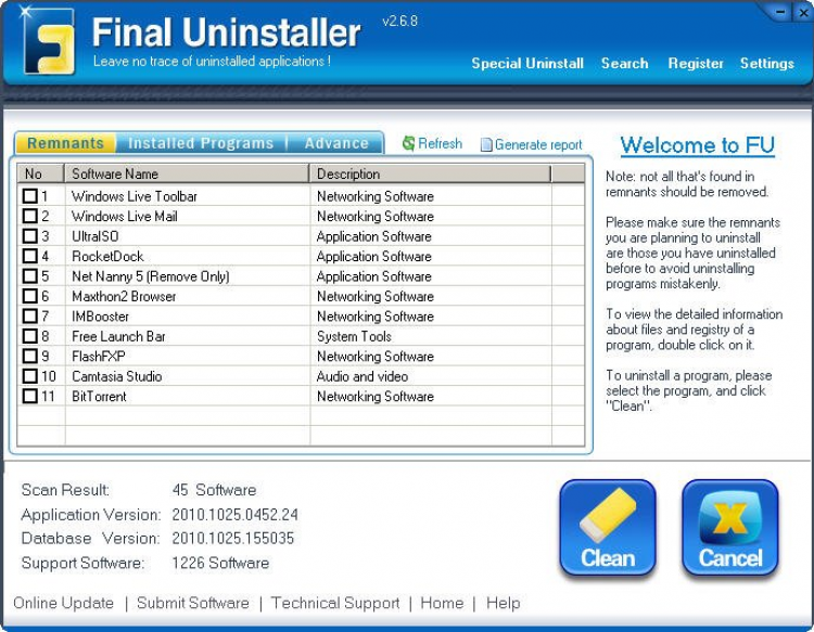 Final Uninstaller - это утилита для удаления программ и очистки системы от мусорных файлов, оставшихся после удаления. Благодаря эффективному алгоритму, Final Uninstaller находит оставшиеся от удаленных программ файлы и ключи реестра и удаляет их .