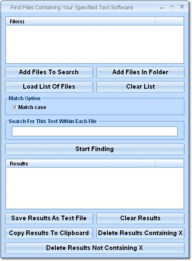Find Files Containing Your Specified Text Эта утилита поможет найти текстовый файлы, которые содержат определенный набор символов, слов или фраз. Текстовые файлы можно добавлять по отдельности, или используя заранее подготовленные списки файлов. Далее нужно ввести искомый текст. После этого программа выдаст список файлов, содержащих этот текст. Результаты поиска можно просматривать в программе, сохранять как текстовый файл или копировать в буфер обмена.