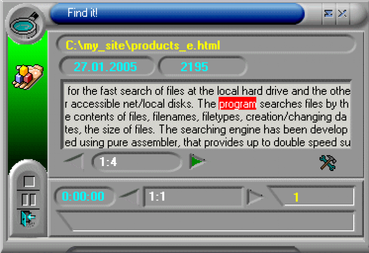 Механизм программы Find it! написан на чистом ассемблере, что обеспечит скорость поиска файлов почти в 2 раза выше, чем в прочих аналогичных программах. При этом, поиск производится без создания индексов, что поможет не только сохранить место на диске, но и сэкономит ваше время. Приятной особенностью программы является возможность поиска не только по названию файла. Вы также можете выполнять поиск по содержимому, типу, дате создания или изменения и даже размеру файла. При этом, Поиск по содержимому осуществляется в нескольких кодировках: DOS-866, WIN-1251, KOI-8, Unicode. Выбор кодировки осуществляется в зависимости от типа файла. Стоит добавить, что программа способна корректно определять более 130 типов файлов, обладает поддержкой русских букв "р" и "Н" в соответствии с требованиями Fidonet, корректной поддержкой украинского языка во всех кодировках.