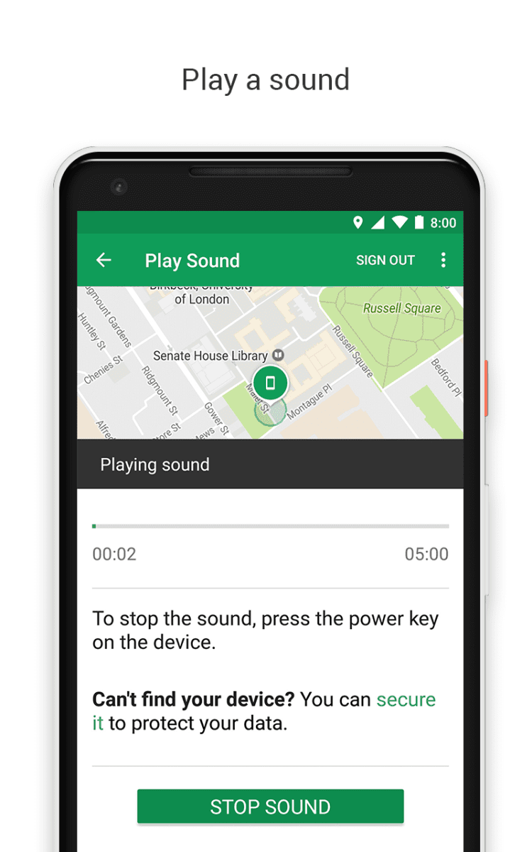 Это приложение позволит вам удаленно управлять своим Android-устройством. Благодаря приложению Find My Device, вы сможете определить местоположение вашего устройства, сбросить PIN-код блокировки экрана, а так же удалять все данные с устройства. Кроме того, чтобы найти смартфон дома, на работе или в другом месте, вы сможете удалённо активировать на нём громкий звуковой сигнал, даже если громкость в настройках устройства установлена на минимальное значение.