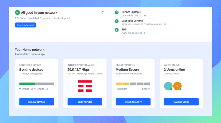 Fing предлагает полный набор необходимых инструментов. Используя их можно выполнить оценку пропускной способности, отследить путь трафика, измерить задержки, проверить DNS и настроить его оптимальным образом, используя синтетические тесты. Кроме этого в его арсенале имеются WiFi-сканер, и инструмент для обнаружения DHCP.