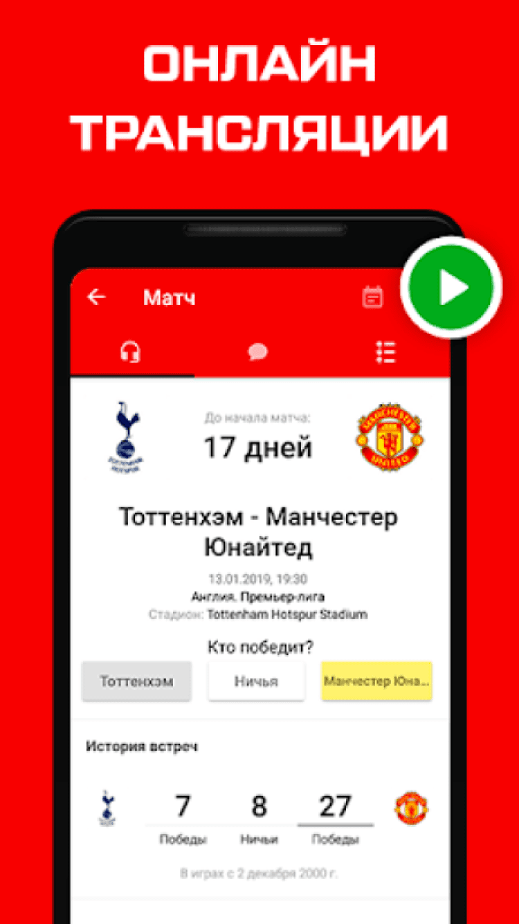 - Онлайн-трансляции матчей, составы команд;