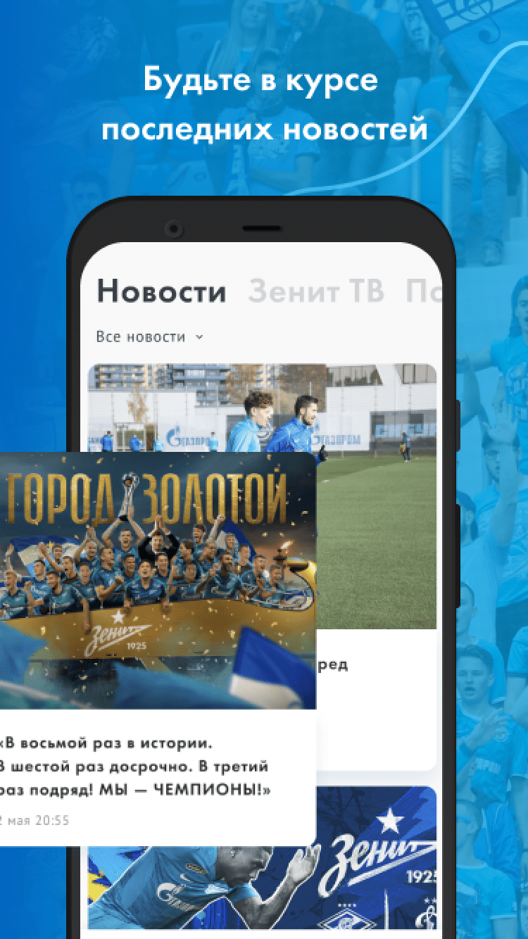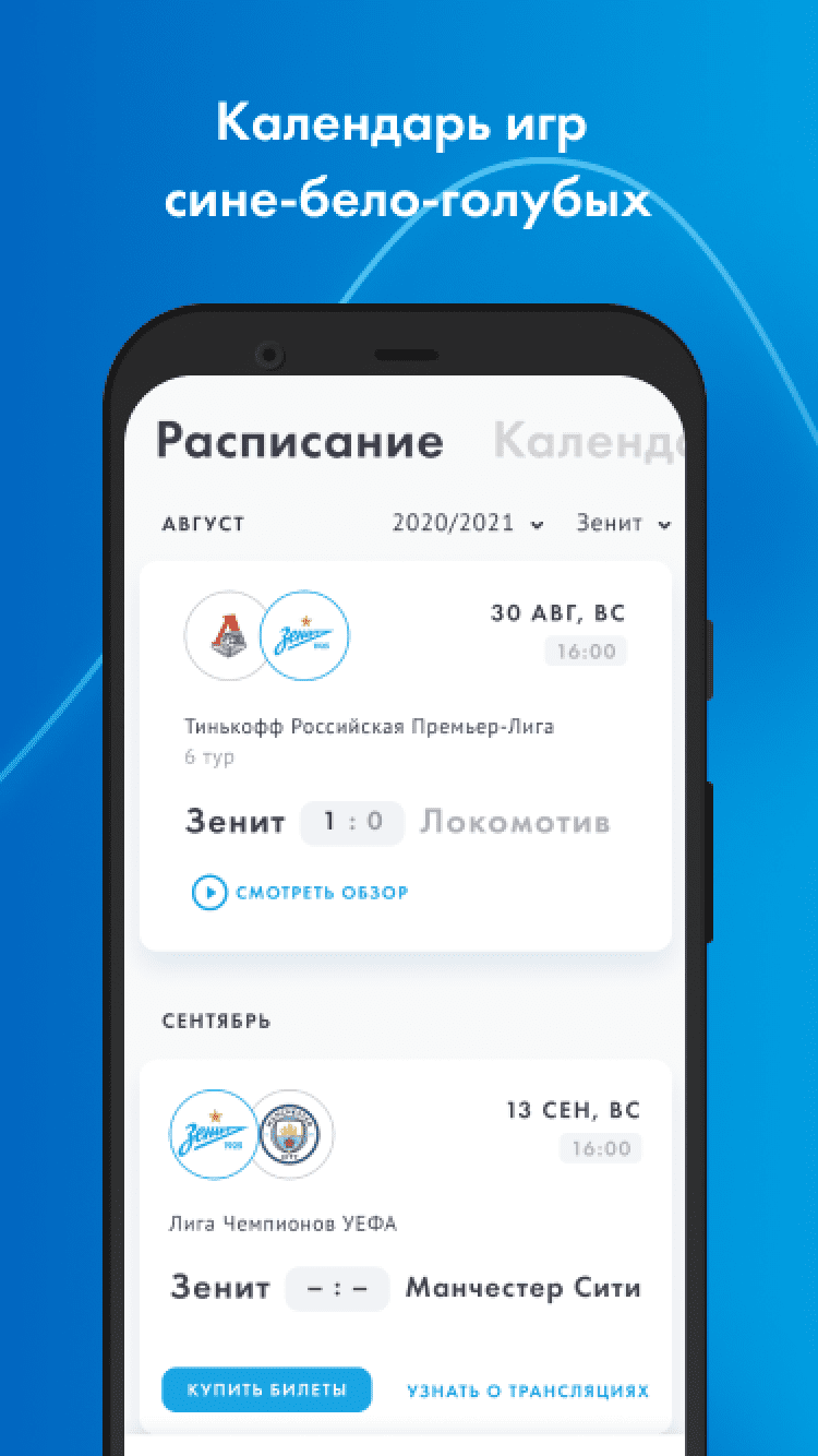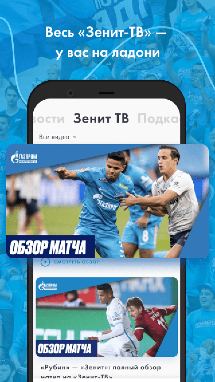 ФК "Зенит" В первой версии официального приложения - все новости основной команды, молодежного состава и зенитовской «Академии», видео-ролики с пресс-конференциями и нарезками опасных моментов, расписание и результаты матчей — как «Зенита», так и остальных команд РФПЛ, телепрограмма, текстовые онлайны матчей и прямые видеотрансляции матчей молодежного состава, профайлы игроков основы и молодежки, тренерского состава и руководства клуба, фотографии.