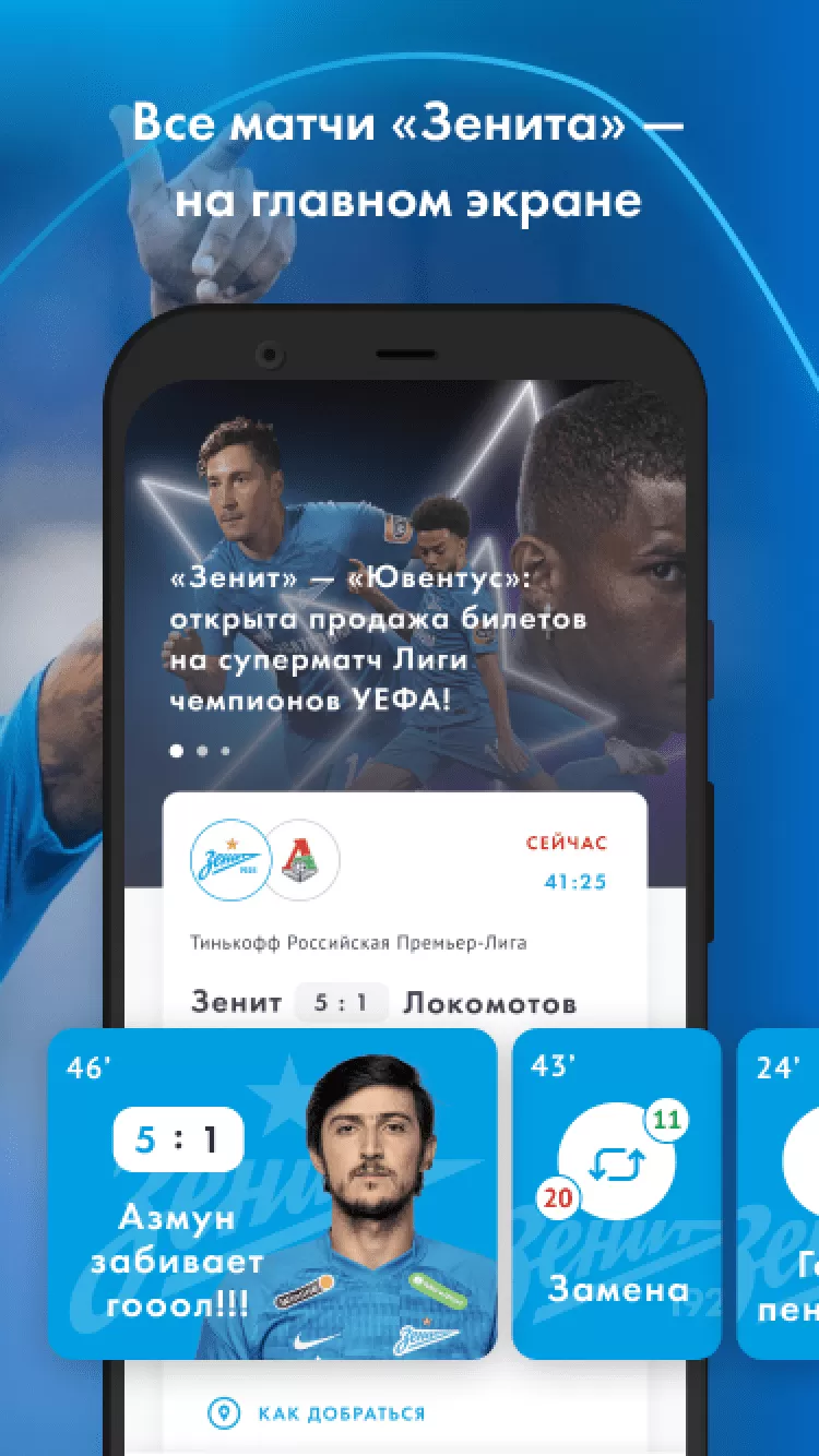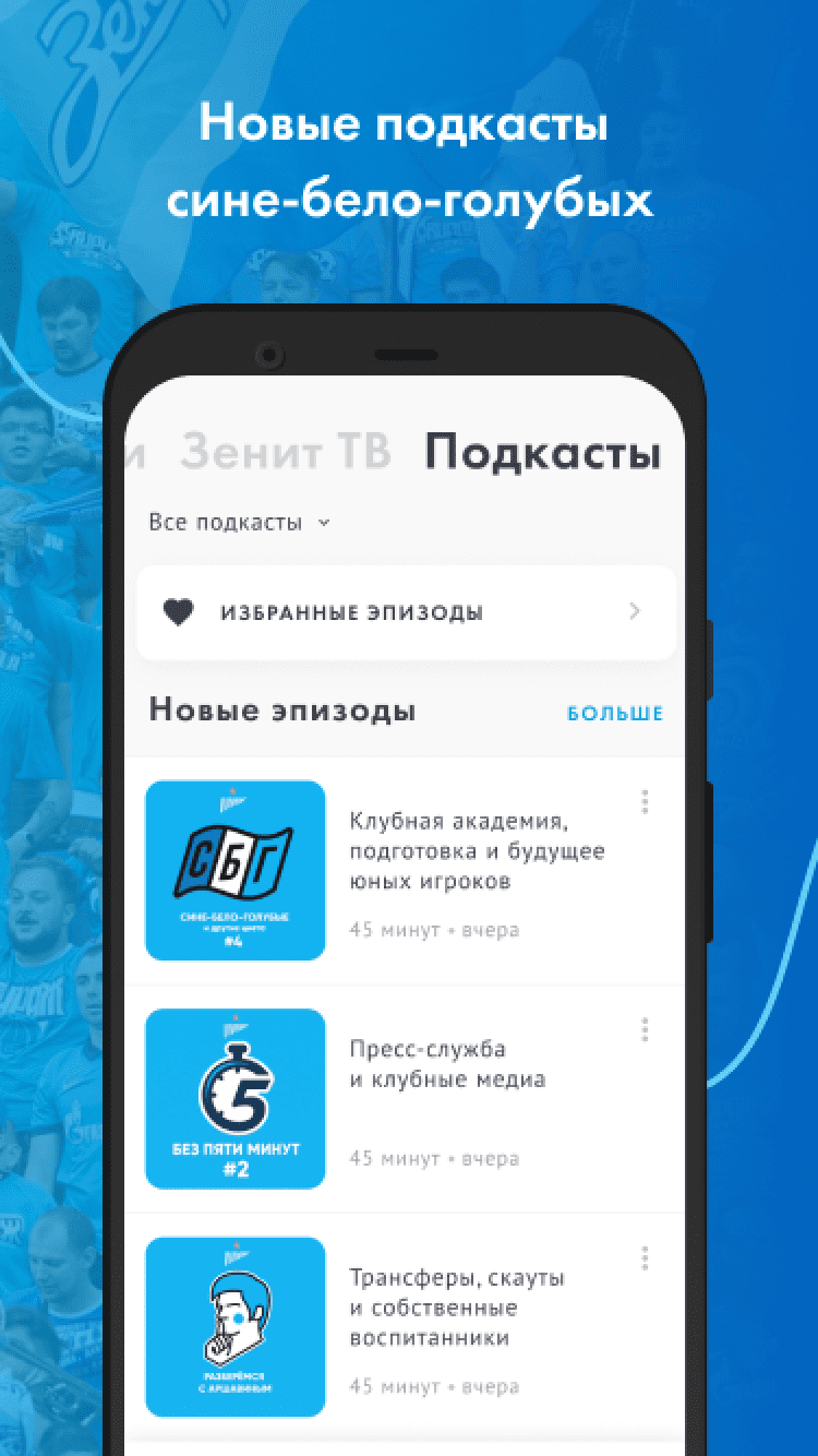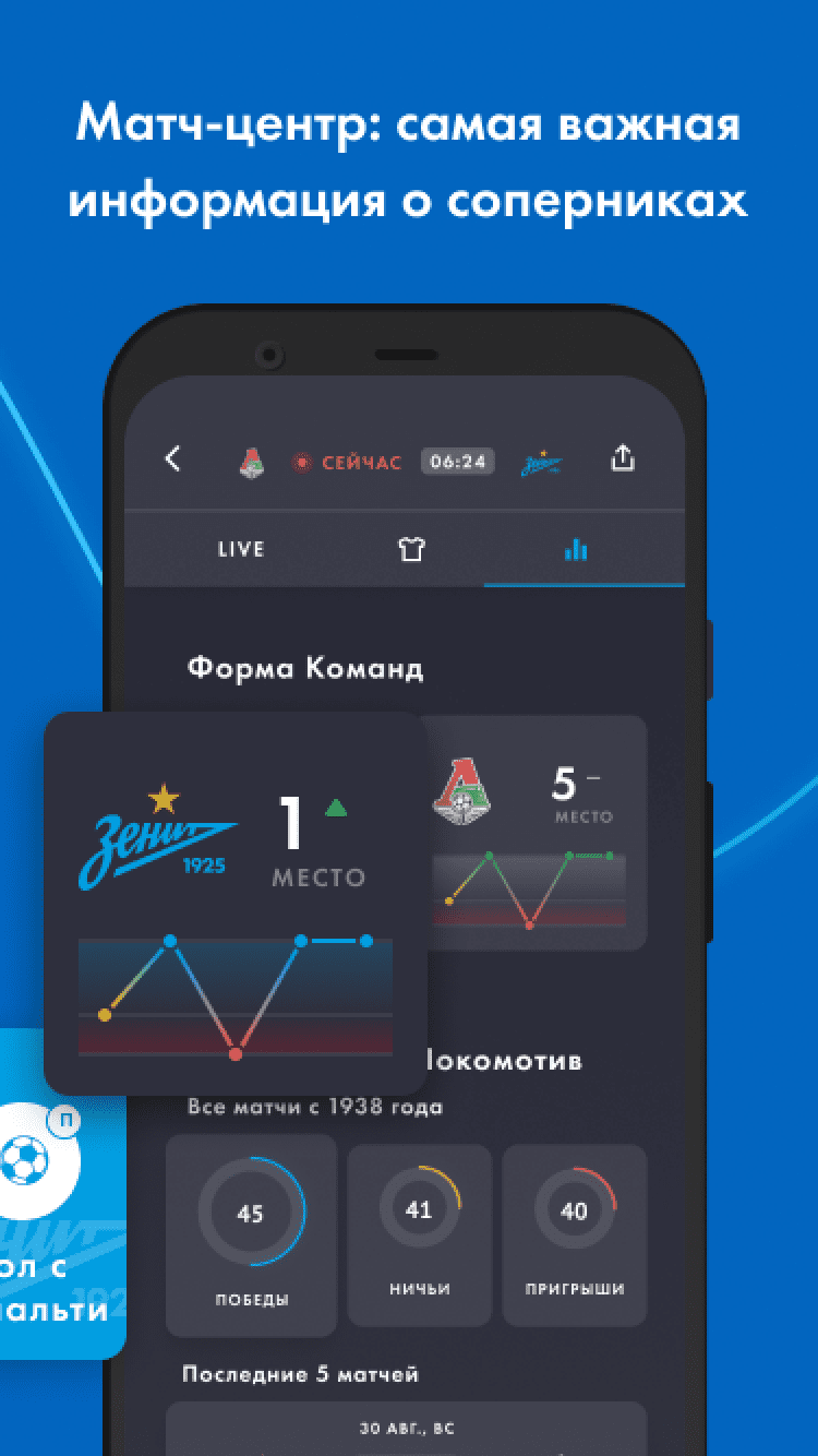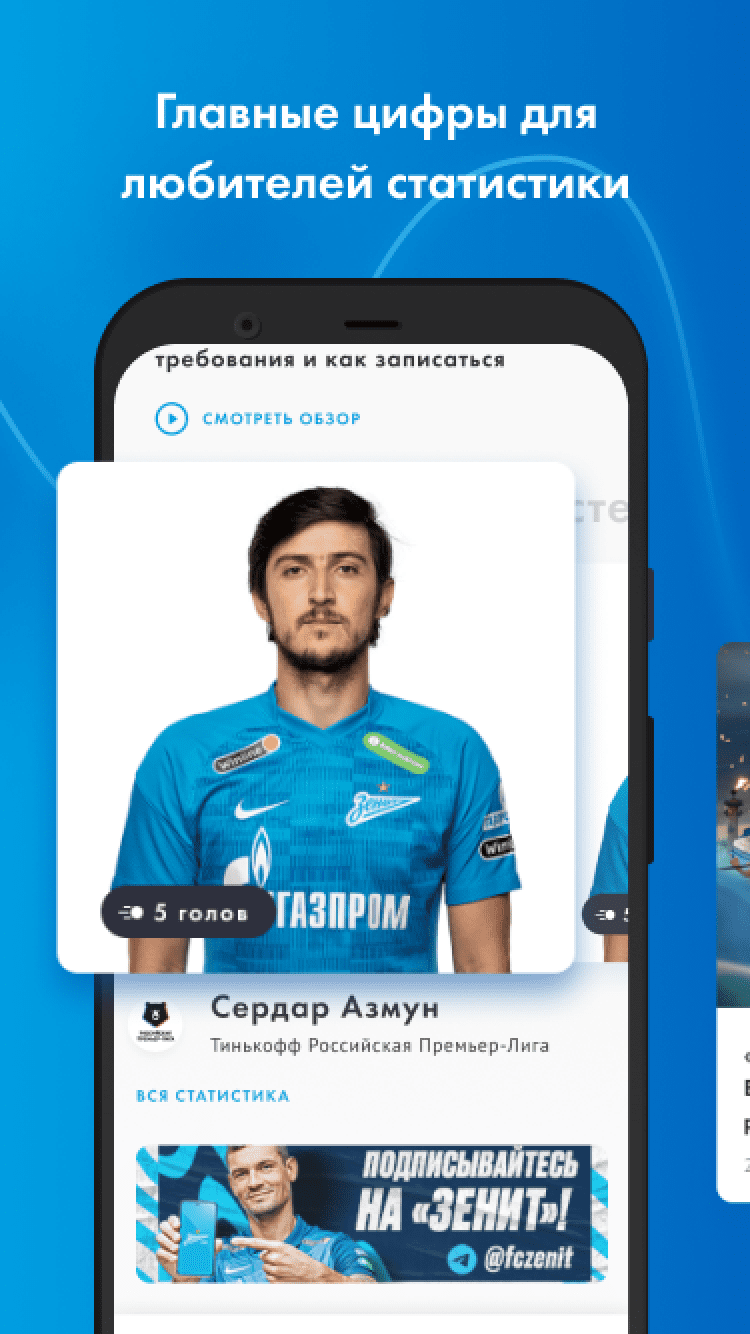 ФК "Зенит" В первой версии официального приложения - все новости основной команды, молодежного состава и зенитовской «Академии», видео-ролики с пресс-конференциями и нарезками опасных моментов, расписание и результаты матчей — как «Зенита», так и остальных команд РФПЛ, телепрограмма, текстовые онлайны матчей и прямые видеотрансляции матчей молодежного состава, профайлы игроков основы и молодежки, тренерского состава и руководства клуба, фотографии.