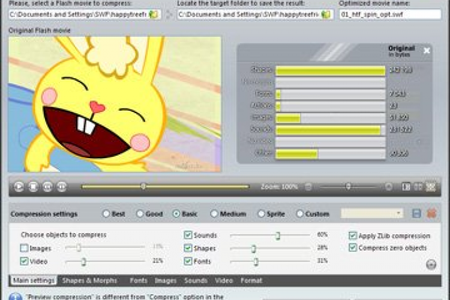 Flash Optimizer обладает расширенными возможностями сжатия звуков (конвертирует стерео в моно, понижает битрейт и т.д.) и видео (изменяет видео битрейт и размер фреймов), что в конечном итоге уменьшает исходный размер SWF файла без существенных потерь в качестве.