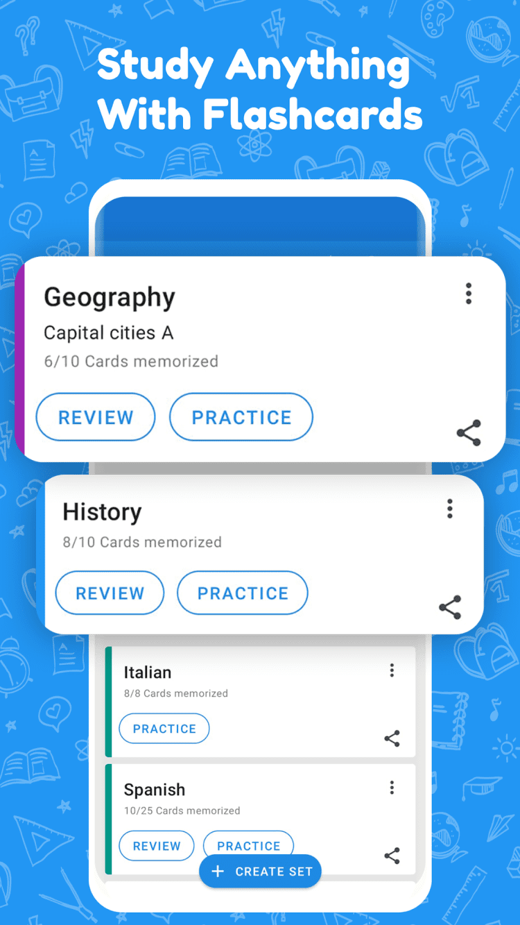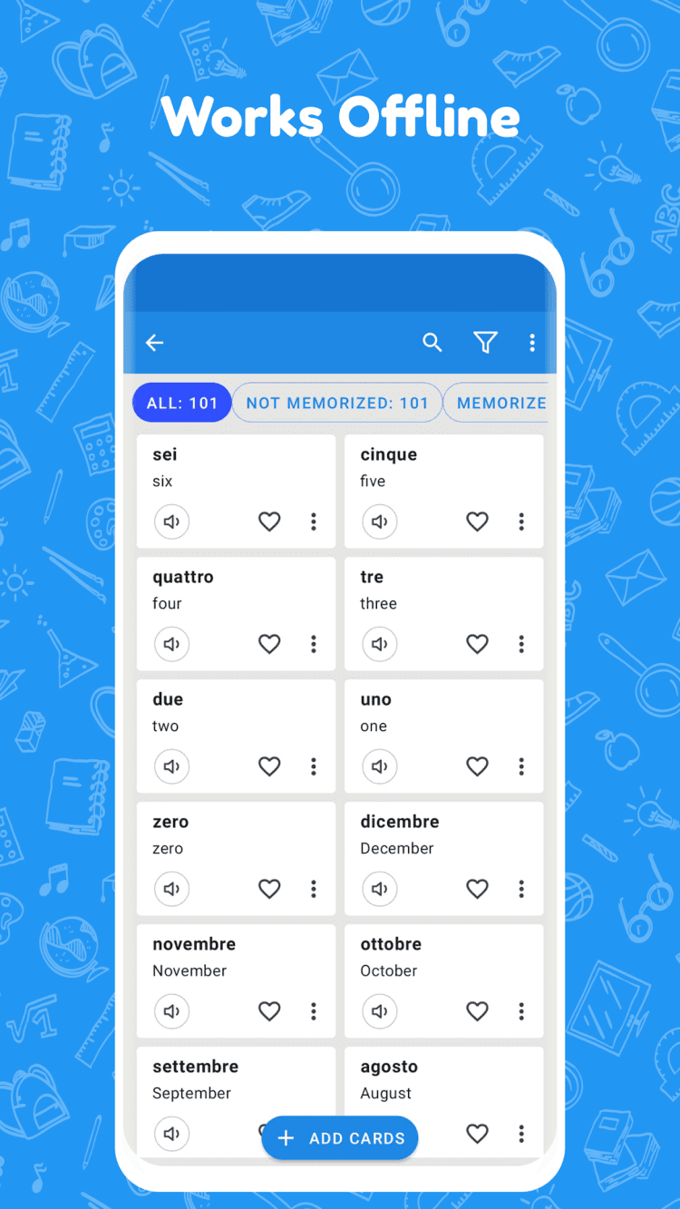 Работа с программой не требует наличия каких-либо особых навыков или знаний. В последней версии приложения, вы можете создать собственные флэшкарты всего в два тапа по экрану мобильного телефона. Создавайте собственные наборы учебных карточек и используйте их для запоминания новых слов или любой другой информации. А поскольку программа не требует доступа в Интернет, учиться можно в любом месте и в любое время.