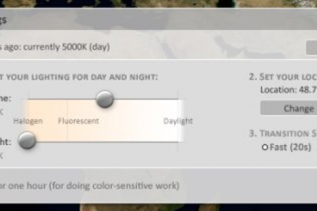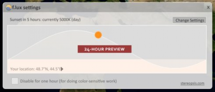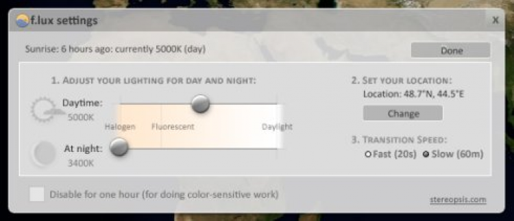 f.lux - Программа, которая автоматически подстраивает яркость и "температуру" цветов дисплея в зависимости от времени суток. При первом запуске необходимо ввести свои географические координаты, чтобы программа "знала", когда за окном день, а когда ночь. Пороги яркости и температуры для разного времени суток задаются пользователем в настройках программы.