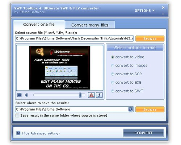 Теперь пользователям нет необходимости устанавливать Flash player на компьютере т.к. Advanced Projector, одна из ключевых возможностей FLV to AVI Converter, позволяет просматривать FLV и SWF ролики даже без установки Flash плеера. Файл ЕХЕ, созданный с помощью FLV to AVI Converter, предоставляет более широкие возможности управления роликом, среди них: установка размера и вида окна, включение и отключение активности мыши или клавиатуры, установка срока действия, разнообразных строк-подсказок, добавление кнопок управления на видео-ролик и многое другое. Функция, которая делает FLV to AVI Converter уникальным это окно приближения, которое позволяет приблизить определенную часть видео ролика и т.о. более тщательно проконтролировать результат конверсии. Все это, наряду с многочисленными другими возможностями, делает FLV to AVI Converter идеальным выбором для создания .exe файлов и осуществления многих других видов конверсии.