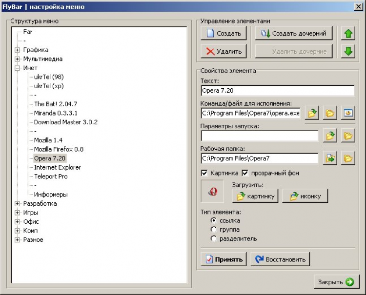 Окно FlyBar`а - небольшая полупрозрачная панелька, свободно перемещаемая по рабочему столу. При клике на ней правой кнопкой мыши открывается ваше меню быстрого запуска. Меню состоит из ссылок, групп и разделителей. Ссылки могут указывать на файл, команду, папку и др. Ссылкам также можно указать параметры запуска и рабочую папку. Каждую ссылку или группу можно снабдить иконкой. В комплекте с программой поставляется около 90 иконок разных программ и игр (вроде WinAmp, Photoshop и т.д.). Количество элементов меню ограничивается только фантазией пользователя. Ссылки можно создавать в "Редакторе меню" или же простым перетаскиванием файла или папки из Проводника/Рабочего стола на окно FlyBar.