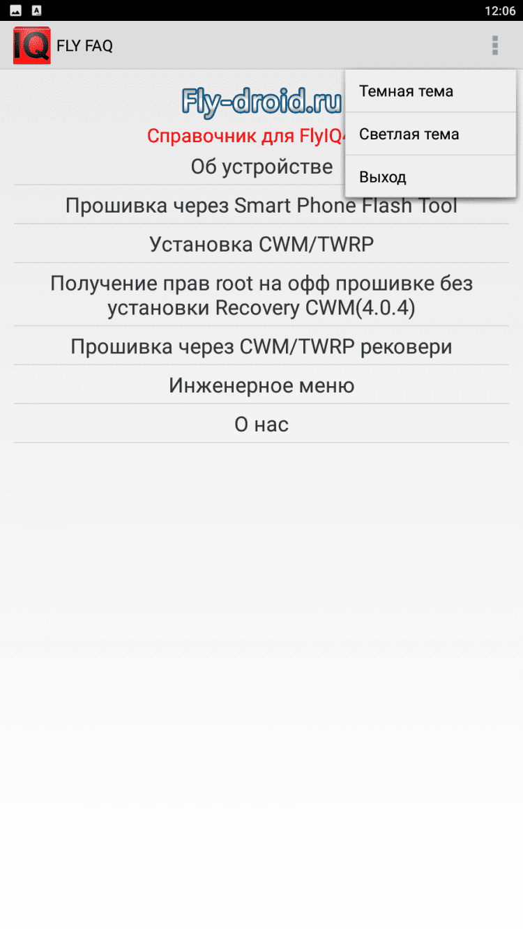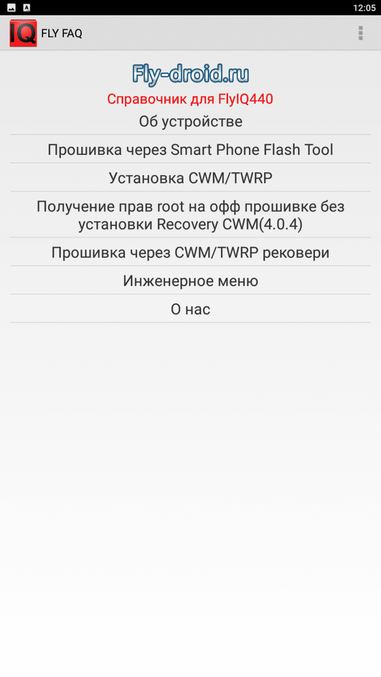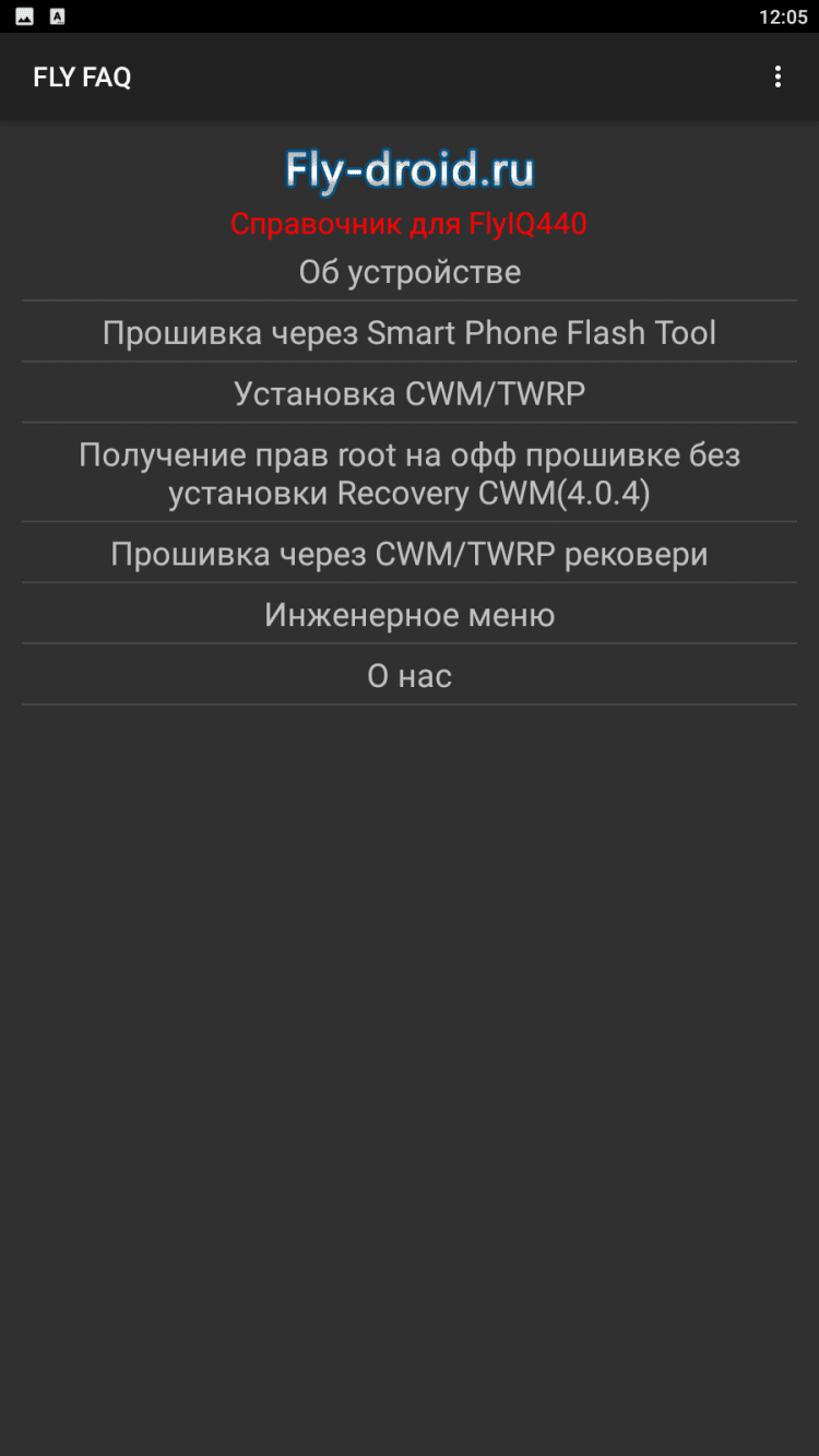 FlyFAQ инструкции для FlyIQ440 В эту программу вошли инструкции и полезные советы для пользователей мобильных устройств Fly IQ 440. Здесь вы найдете подробные технические характеристики своего устройства, информацию о различных прошивках, о получении прав суперпользователя, а так же о многом другом. Для удобства чтения, программа содержит темную и светлую темы оформления.