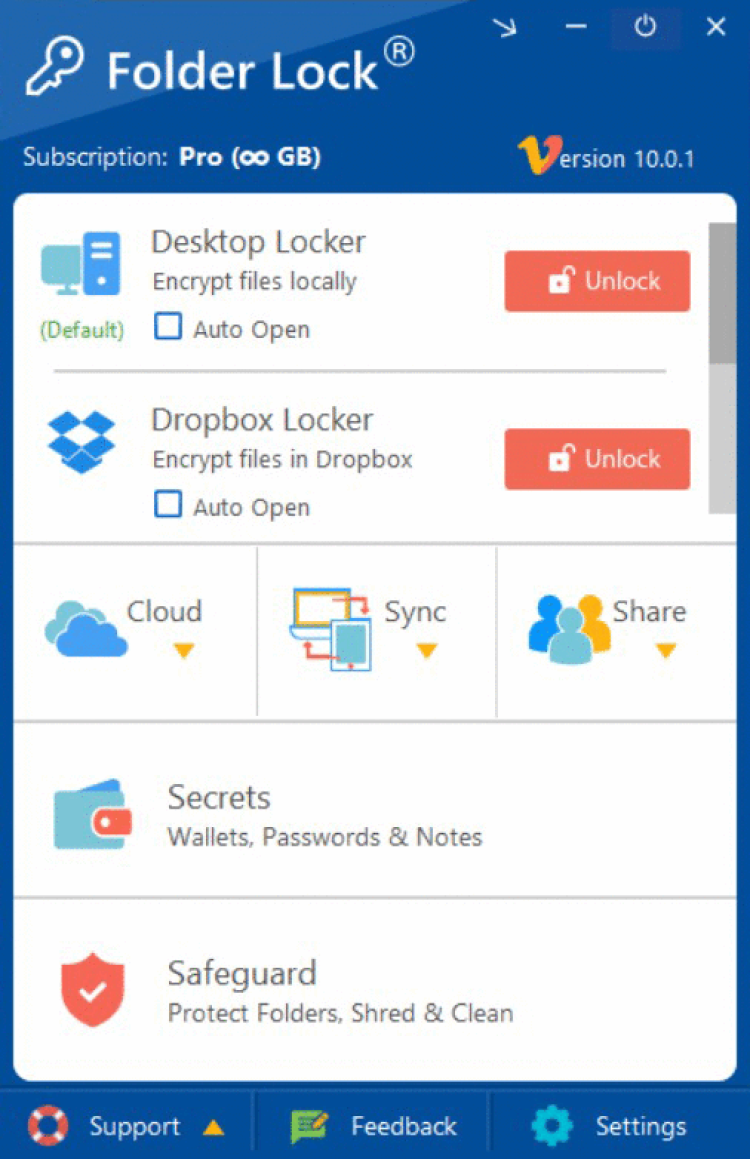 Folder Lock предлагает вам 256-битное AES шифрование "на лету", а также синхронизацию зашифрованных файлов с облачным хранилищем. Программа автоматически шифрует и синхронизирует ваши файлы. Если вы не хотите шифровать ваши файлы или папки, то вы можете заблокировать доступ к ним с помощью пароля, или спрятать их от посторонних глаз.