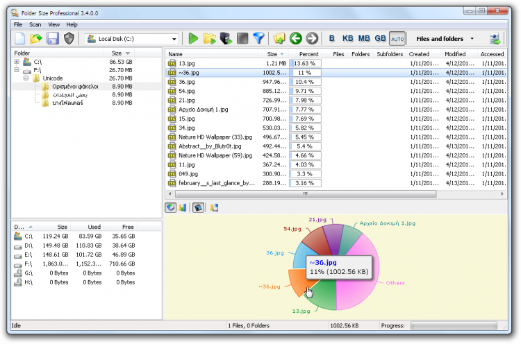 Полученные результаты Folder Size позволяет сортировать по размеру, чтобы узнать, какой файл или папка занимает больше всего места на диске. При необходимости можно сканировать не весь диск, а только отдельные директории, что может существенно сэкономить время. Folder Size также строит диаграммы, которые помогут визуально отобразить файлов и папок. Доступно два вида диаграмм - круговая и растровая. Кроме этого, результаты сканирования можно распечатать на принтере.