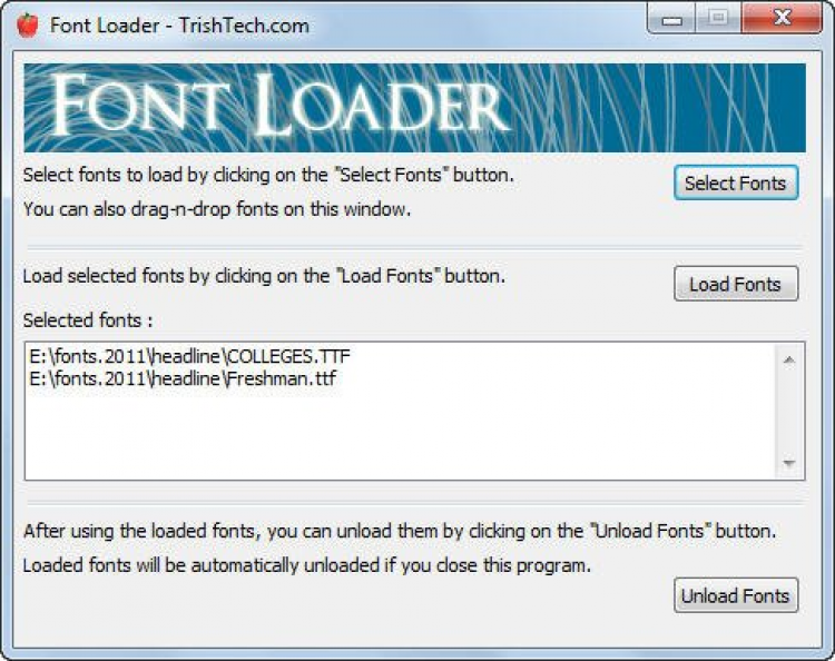 Font Loader - небольшая утилита, которая позволяет загружать в системы различные шрифты. Загруженные шрифты можно использовать в любых программах. После того, как шрифты использованы, и надобность в них отпала, их можно легко и быстро "выгрузить" из системы.