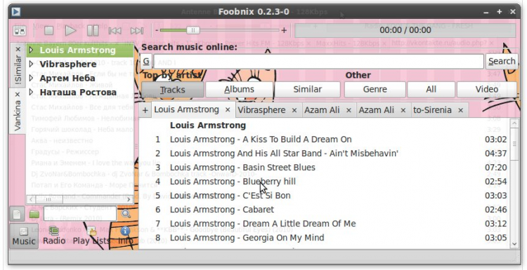 - Интеграция с популярным ресурсом Last.FM (Отображение и прослушивание лучших песен, любимых песен, исполнителей)