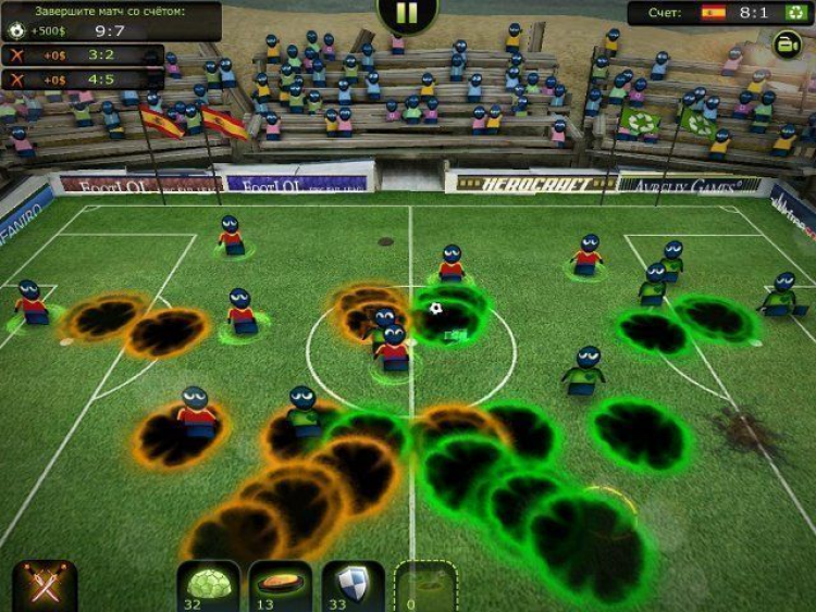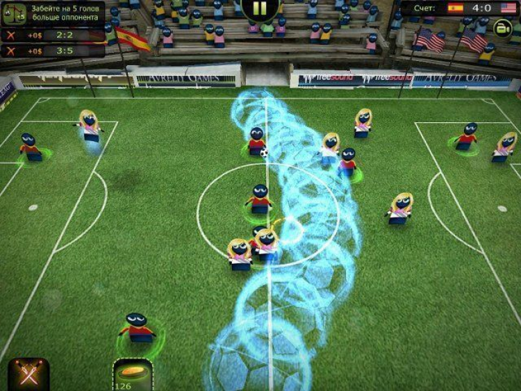 За каждую победу команда получает премиальные деньги, на которые можно купить улучшение характеристик или внешнего вида игроков. Дополнительные призовые можно также получить, если во время матча будет достигнут определенный счет. После прохождения чемпионата, который включает в себя более 60 уровней, вам наверняка придутся по нраву и другие режимы игры. Чтобы отвлечься от напряжения турнирных схваток, вы можете потренироваться в определенных видах задач, сыграть матч по интернету с другом или случайным соперником. Загружайте игру и погрузитесь в футбол, каким вы его еще никогда не видели!