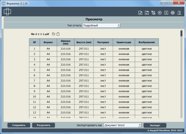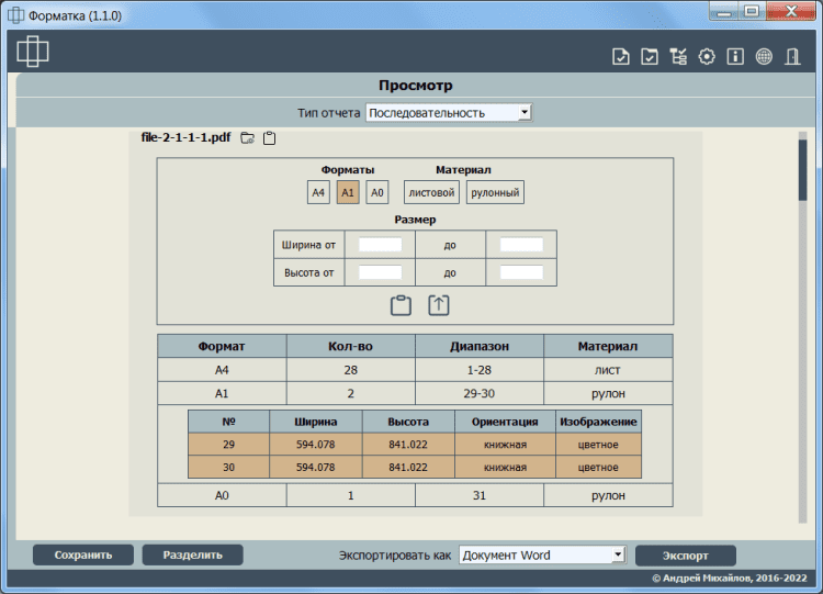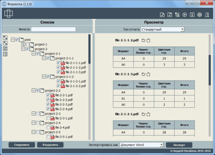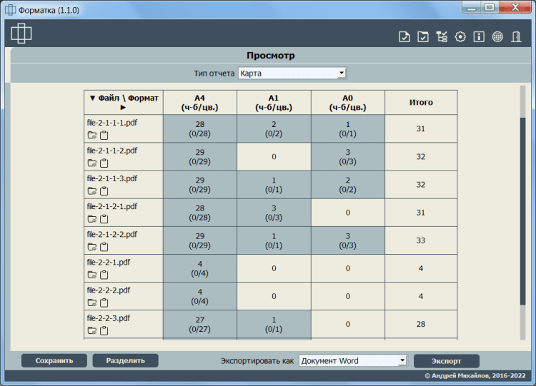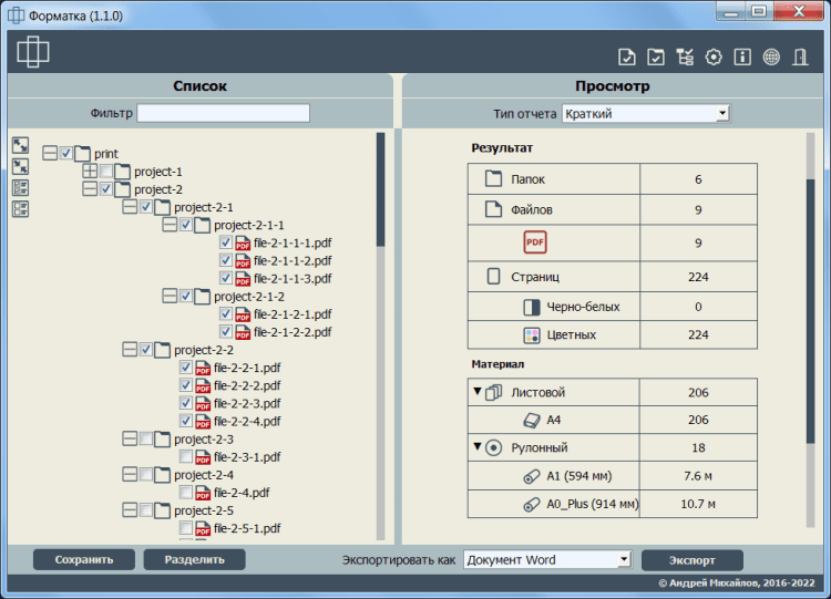 - определение количества и размера листов в файле/группе файлов/каталоге;