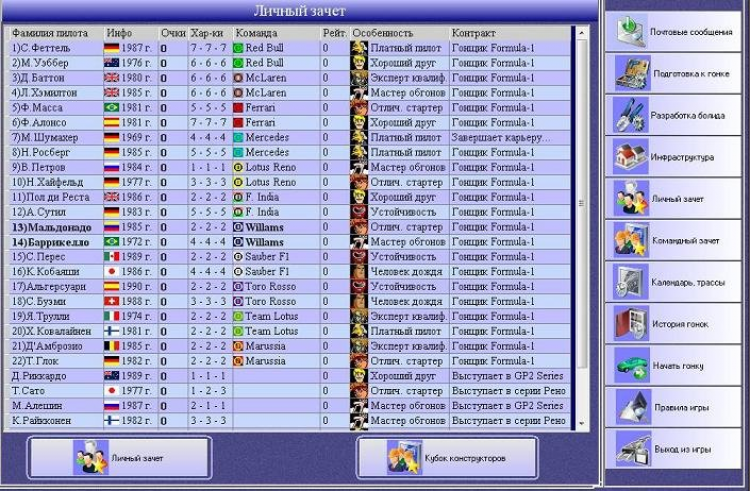 Формула-1 Менеджер от Алдуды - это игра "Формула-1 Менеджер" является моей первой крупной компьютерной игрой, написанной на современном языке программирования (Visual Basic). Первая версия игры вышла в конце 2001 года, задолго до появления у меня Интернета и основания проекта Алдуда. Эту игру я писал полностью для себя, ибо в то время не существовало достойных игрушек в моем любимом жанре спортивного менеджера. Поскольку я никогда не был ярым фанатом Формулы-1, то я с легкостью отходил от всех принципов и правил настоящей Формулы.