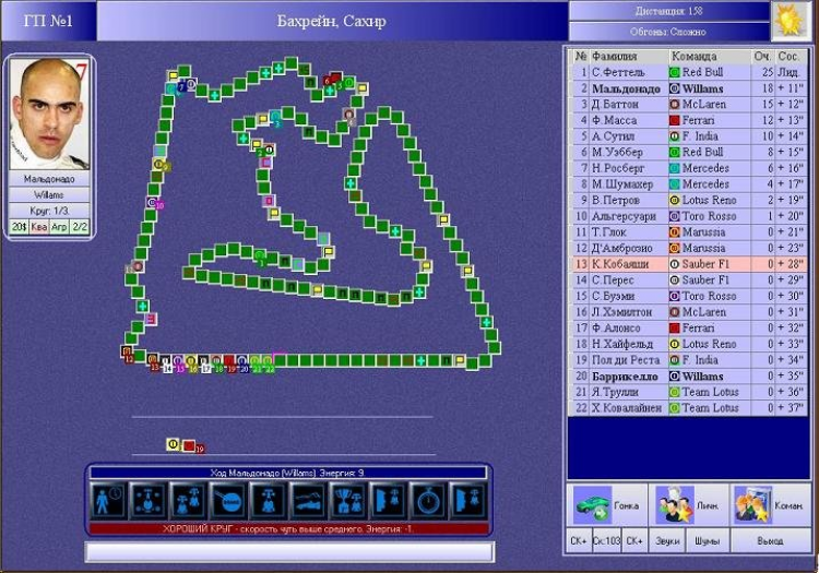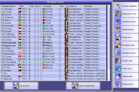 Единственное, что связывало игру с Формулой были только реальные фамилии пилотов и названия команд. На создание первой версии игры ушло полгода работы - очень много, но дело в том, что помимо написания кода приходилось изучать программирование, разбираться с особенностями среды Visual Basic. Вопреки поговорке "первый блин - комом", созданная мной игра оказалась очень интересной и захватывающей. Я с удовольствием сам проходил сезоны в игре, попутно улучшая баланс и выпуская новые версии. Возможно, именно успех этой игры и предопределил мое желание создавать другие оригинальные компьютерные игры... Однако по-настоящему классной стала третья часть игры, созданная в 2004 году. В ней был впервые применен принцип установок хода на гонку.