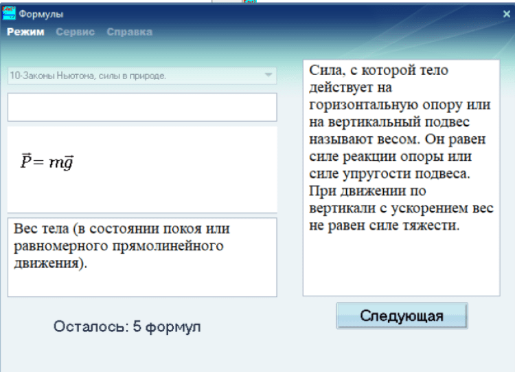 ОБУЧЕНИЕ. В этом режиме можно просмотреть все формулы по выбранной теме с комментариями;