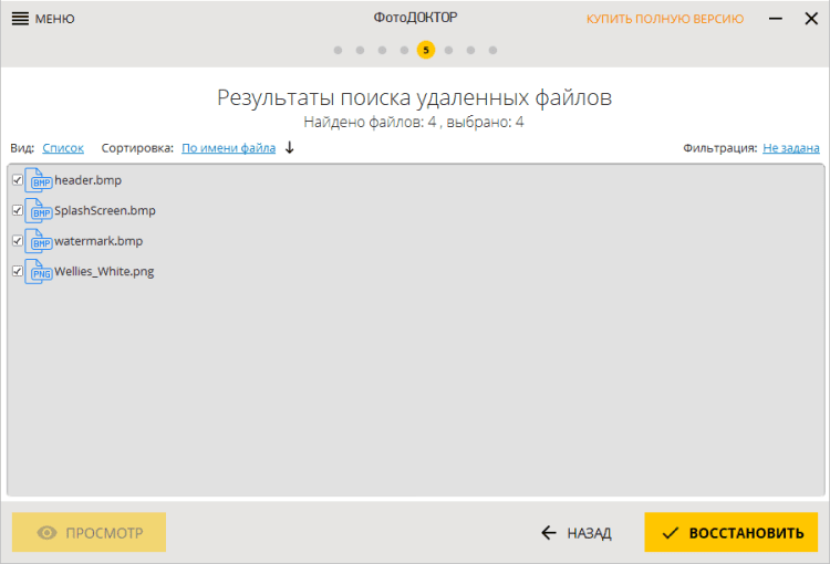 - просмотр удалённых фотографий перед восстановлением;