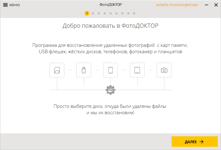 ФотоДОКТОР - это новая программа для восстановления удалённых фотографий с карт памяти, USB флешек, фотокамер и мобильных телефонов. Она позволяет быстро найти и сохранить стёртые файлы, при этом поддерживается как восстановление всех найденных фотографий, так и выборочное. ФотоДОКТОР даёт возможность предварительно просматривать JPEG файлы прямо во время поиска и фильтровать фото в зависимости от формата. Программа имеет интерфейс на русском языке, проста в освоении и даже включает встроенный видеоучебник!