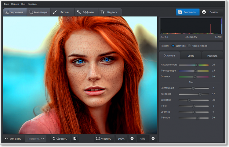 Продвинутый редактор, позволяющий быстро и качественно улучшать фотографии. Программа вносит все изменения в безопасном режиме, поэтому вы всегда можете отменить любые настройки, не теряя при этом правки, внесенные позже.