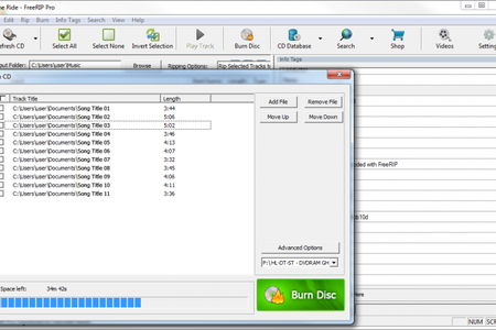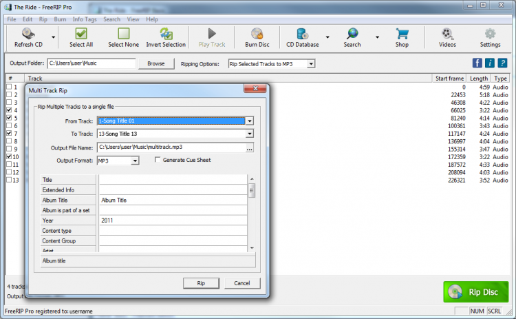 С помощь FreeRIP MP3 Converter можно копировать музыку с дисков в пакетном режиме, настраивать параметры качества звука и уровень громкости. При копировании треков также копируются и метаданные. При необходимости, информацию о треке можно искать в сети прямо из программы. Также можно искать клипы, обложки альбомов и тексты песен. Поддерживаются ID3 v1 и v2 теги.