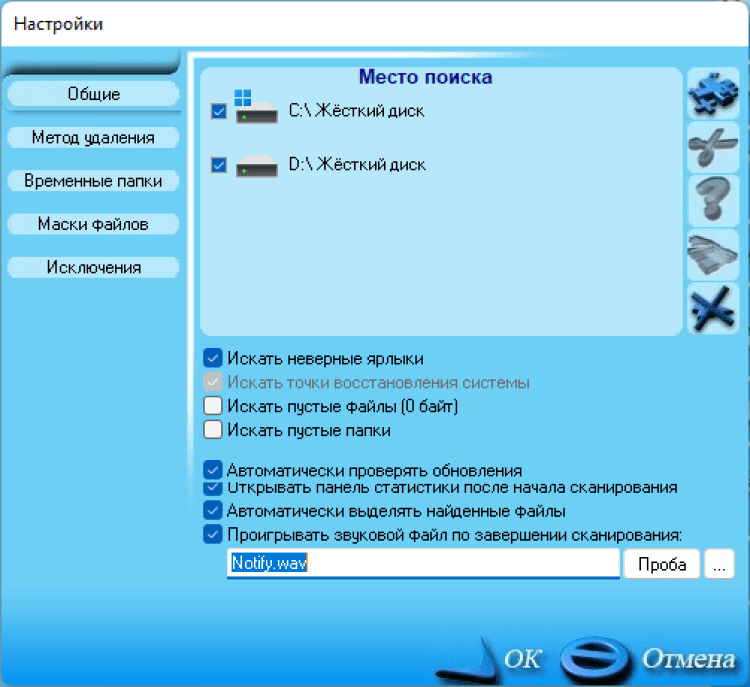 Поиск неверных ярлыков. Поиск точек восстановления системы. Поиск пустых файлов и папок. Поддержка исключений файлов и папок. Поддержка различных методов удаления (в корзину, не помещая в корзину, физическое стирание с диска, перемещение в резервный архив с последующим восстановлением). И другие приятные мелочи.