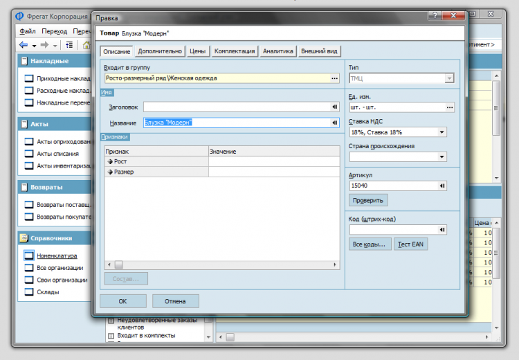 - Учет товара по хар-м (длина, вес, объем); по росту/размеру; по произв. набору признаков; учет ГТД и страны происх., мин/макс запаса • Просмотр инфокарточки товара из справочника номенклатура, из спецификации документа;