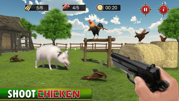 Frenzy Chicken Shooter 3D — небольшая игра, в которой вам предстоит оттачивать свою меткость на курах. Выберите оружие и отправляйтесь на ферму и постарайтесь как можно быстрее перестрелять всех кур. Уровни имеют ограничение по времени, а некоторые — по количеству патронов. Будьте внимательны, поскольку после первого выстрела, куры начинают бегать по локации и целиться в них станет гораздо сложнее.