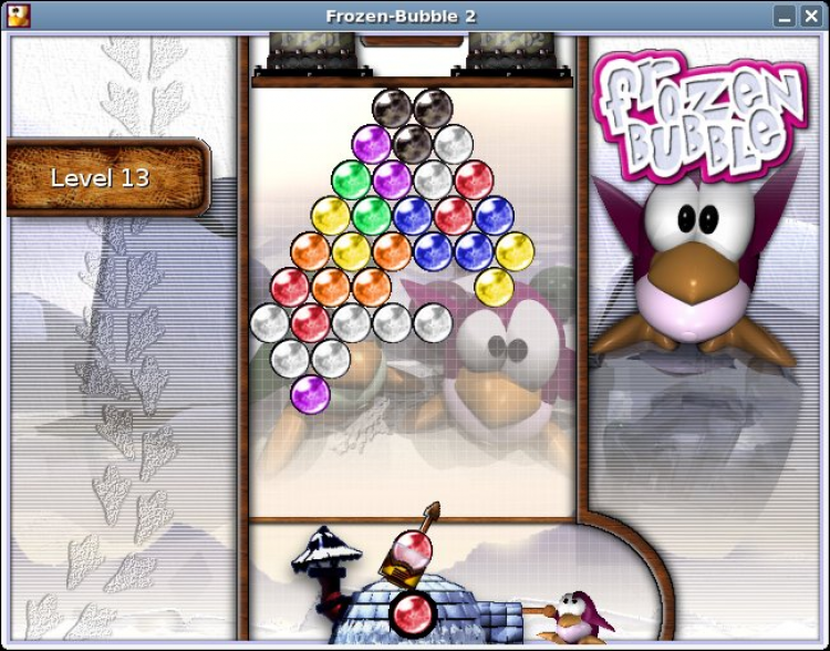 Frozen Bubble - бесплатная компьютерная игра. Цель игры: сбить все шарики, находящиеся над пингвином. Пингвин стреляет разноцветными шариками из пушки, при попадании на группу из двух или более шариков того же цвета, шарики падают вниз. Во время игры шарики, находящиеся над пингвином, постепенно смещаются вниз, а достижение ими нижней границы игрового поля означает проигрыш. Полностью проиграть невозможно, можно лишь проиграть отдельный уровень — при этом вы начинаете его заново. Сохранение, в отличие от многих других игр, отсутствует, возможна лишь запись результатов.