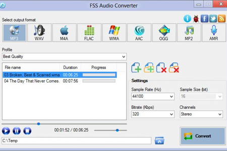 FSS Audio Converter - это программа, которая поможет вам конвертировать аудио файлы из WMA в MP3, WAV в MP3, MP3 в WAV, FLAC в MP3, AAC в MP3 и так далее.