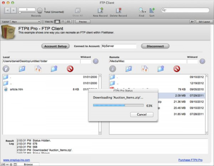 FTPit Pro - это плагин для FileMaker, позволяющий передавать файлы с вашего компьютера и на него через FTP. Чтобы воспользоваться функционалом приложения вам не нужно быть продвинутым пользователем FileMaker Pro Calculations или знать какие-либо языки программирования: все действия в программе очень просты.