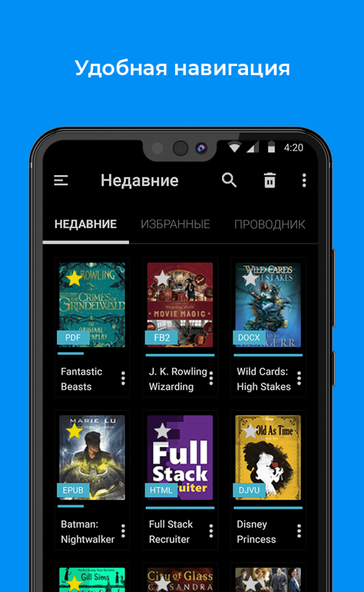 fb2, ePub, txt, PDF, doc, docx, cbr, cbz, rtf, DjVu, DjV, html, htm, mobi, xps, oxps, odt, rar, zip, 7z, MP3. - Удобный и стильный интерфейс.