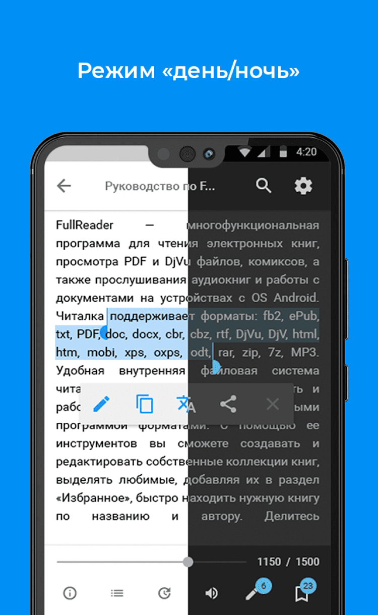 Создавайте цветные пометки в тексте, выделяя важные моменты, а также закладки на интересных страницах! Управление созданными пометками и закладками доступно непосредственно в окне чтения книги, а также в специальном разделе меню приложения. Все пометки рассортированы по книгам и могут быть экспортированы в отдельный документ. Создание закладок доступно также в аудиокнигах. - Режимы день/ночь.