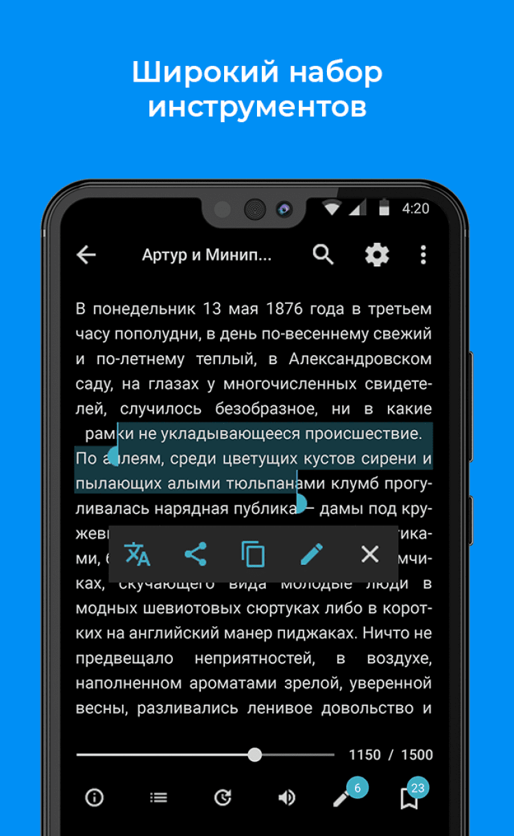 Меняйте расположение и набор инструментов окна чтения читалки, исходя из своих нужд и предпочтений. - Чтение вслух.