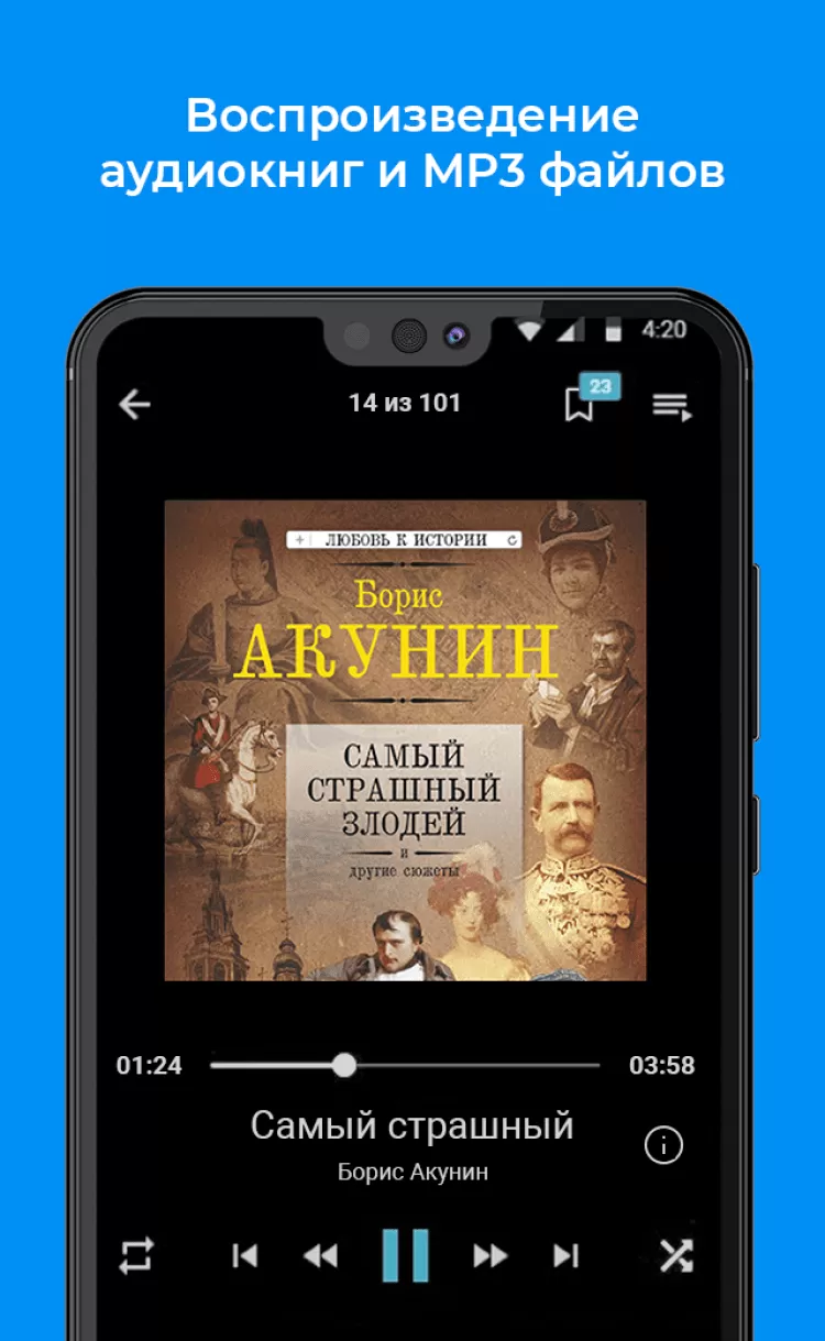 Поддержка работы с аудиокнигами формата MP3. Помимо воспроизведения файлов, вы сможете создавать закладки в окне воспроизведения, формировать свои плейлисты и управлять чтением. - Виджеты и ярлыки книг.