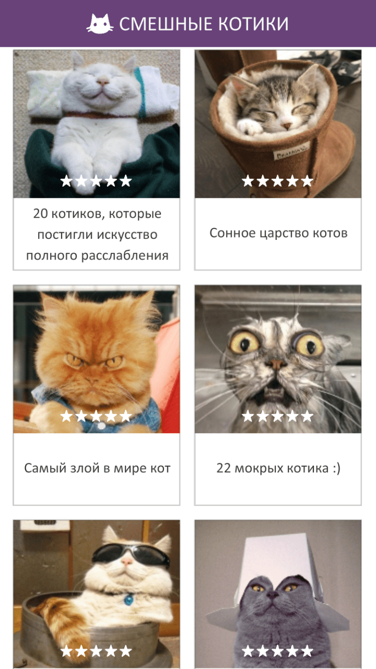 Funny Cats Бесплатное приложение, в котором вы сможете насладиться просмотром самых прикольных фотографий с изображениями смешных котиков. Количество фотографий в программе постоянно увеличивается, а так же вы можете предложить фотографии своих любимцев, отправив их разработчику по электронной почте.