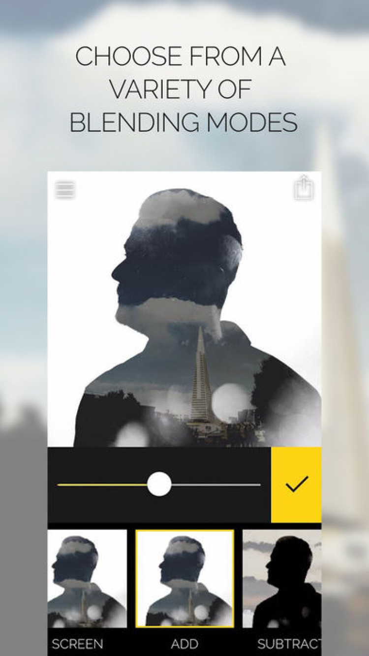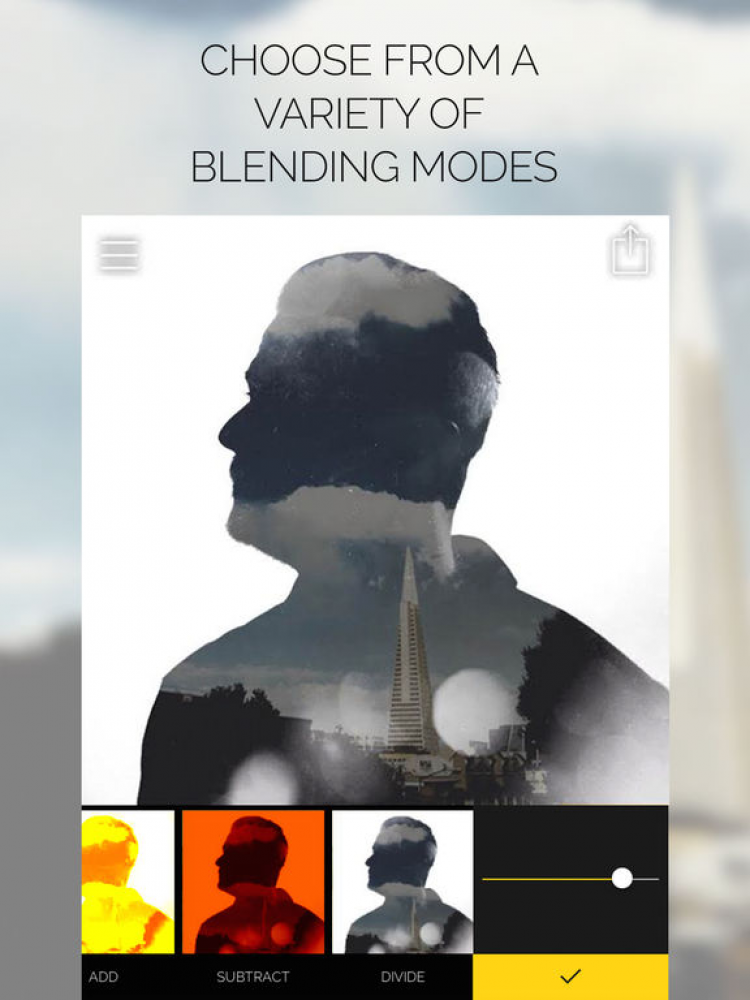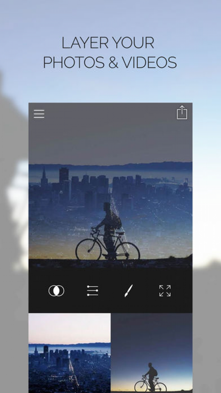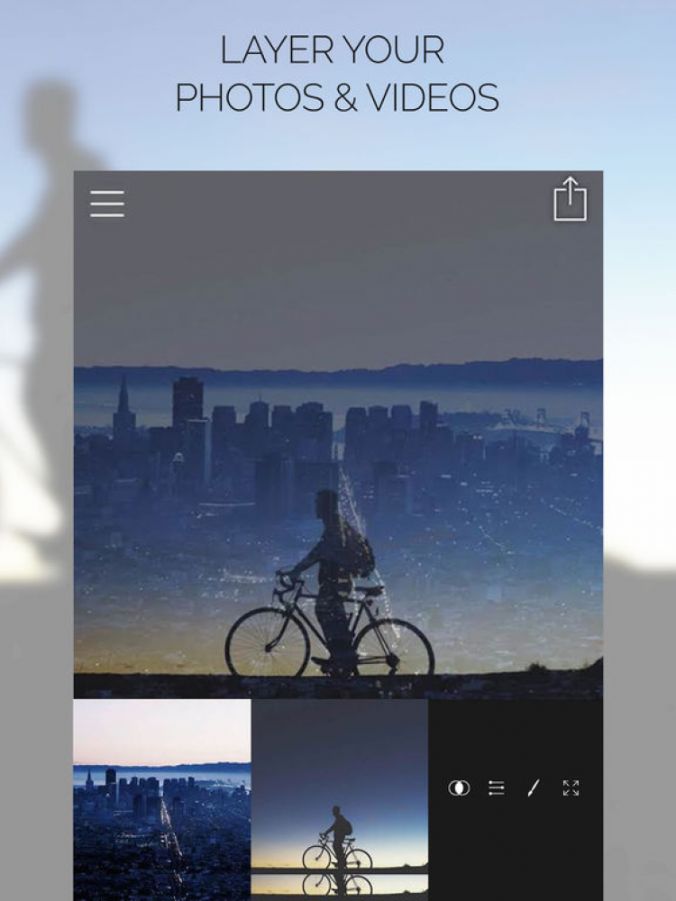 Использовать приложение необычайно просто. Для этого, всего лишь выберите фотографию или видео, которое вы хотите использовать в качестве верхнего или нижнего слоя, затем установите подходящий режим блендинга, листая влево или вправо, откорректируйте цвет для каждого слоя по отдельности или наложите подходящую маску и всё готово.
