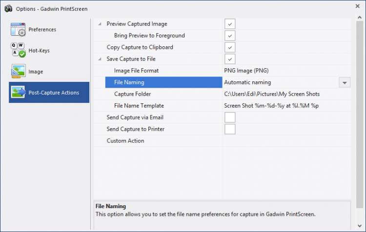 Помимо этого в настройках можно включить/отключить опцию отображения курсора на скриншоте, выбрать нужный формат, папку для сохранения, задать шаблон для автоматического именования скриншотов и т.д.