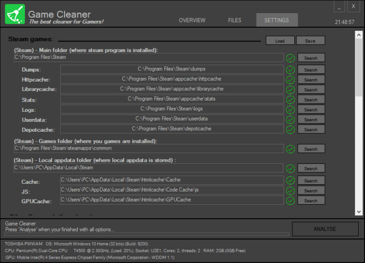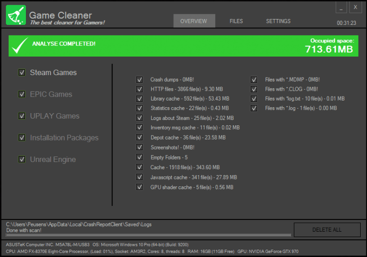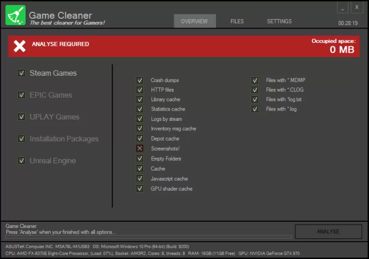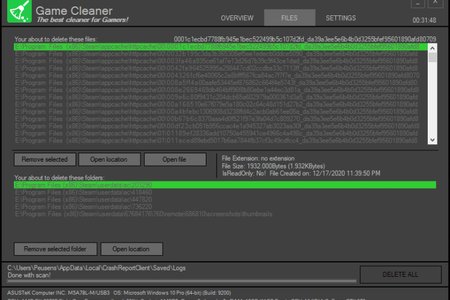В добавок к этому оан проверяет дополнительные файлы, в которых может копиться ненужная информация, включая MDMP, ClOG, log.txt, log, year_.txt, Direct X, DotNet, PhysX и VCRedist. В качестве небольшого бонуса, GameCleaner отображает информацию о характеристиках компьютера.