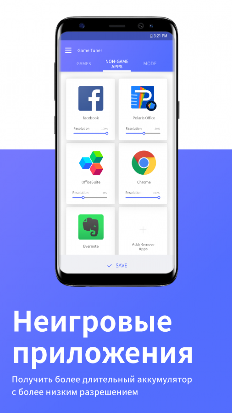 Кроме изменения настроек гаджета во время игр, Game Tuner для Android позволяет изменять разрешение экрана для неигровых приложений. Это поможет снизить расход энергии при работе со слишком требовательными приложениями.