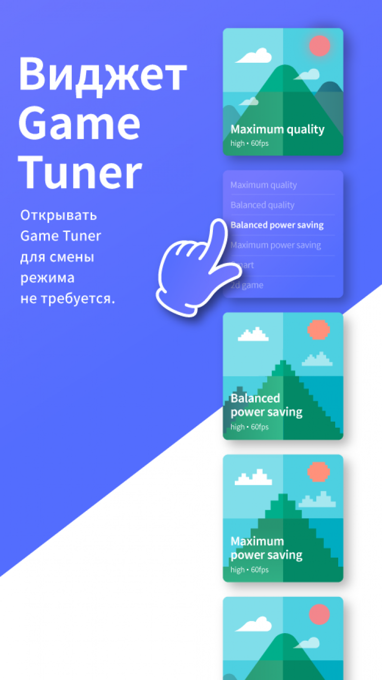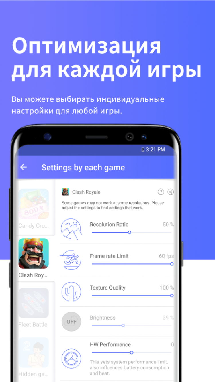 Приложение Game Tuner поможет вам реже заряжать свое мобильное устройство и улучшить его быстродействие. Для этого, она позволяет изменять разрешение экрана, частоту смены кадров и качество текстур в играх. Кроме того, программа позволяет изменять частоту обновления приложений для уменьшения использования памяти гаджета.