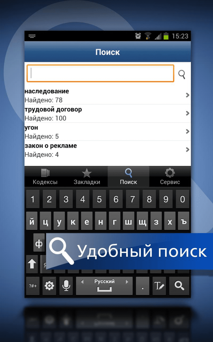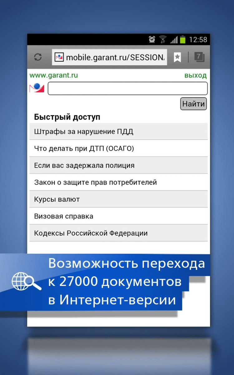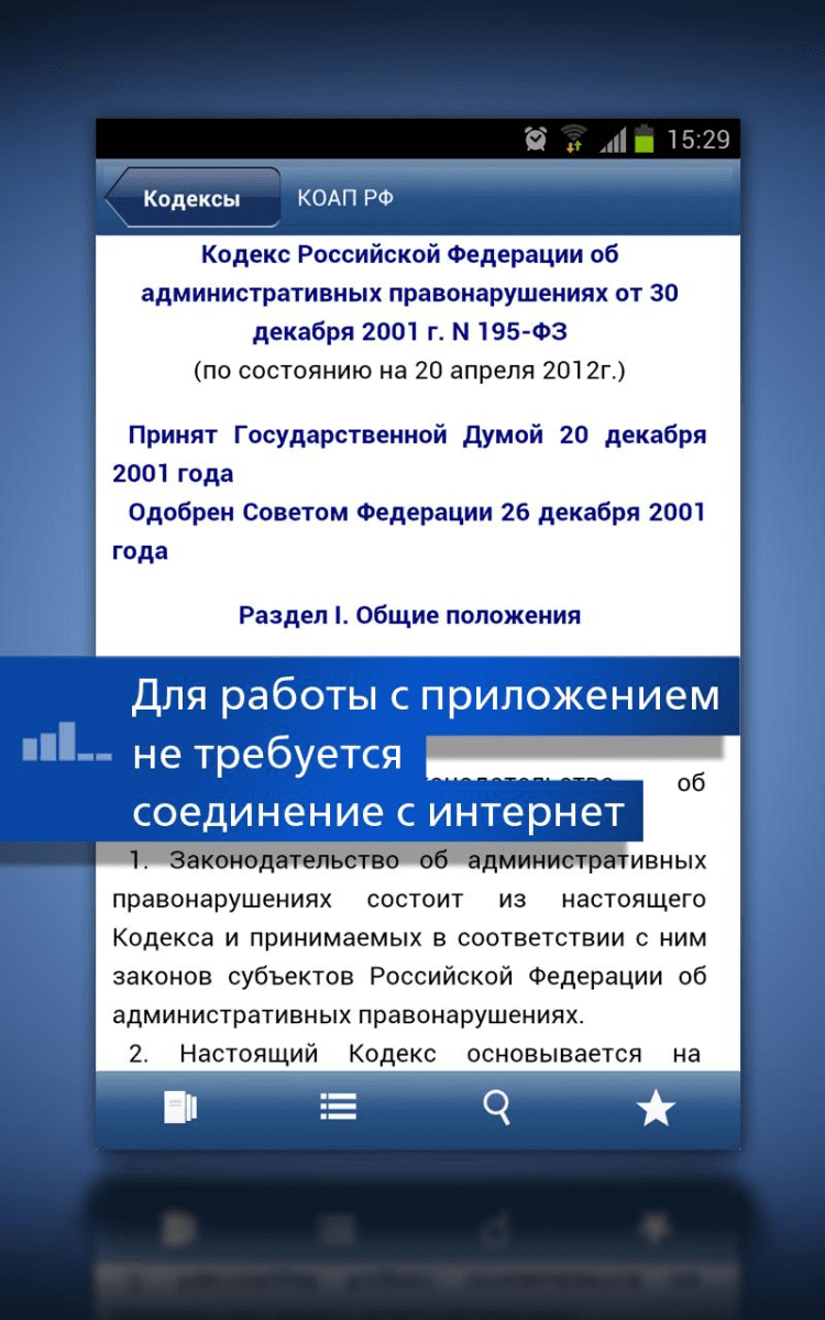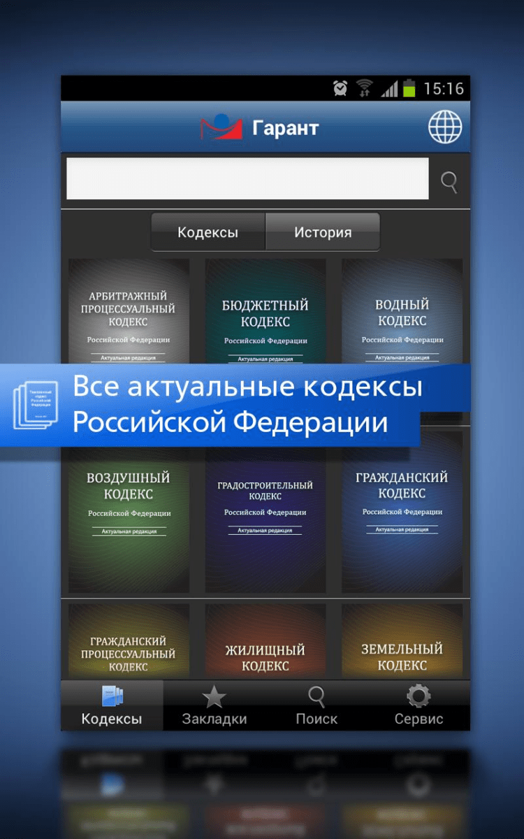 ГАРАНТ. Все кодексы РФ Приложение содержит основные кодексы и Конституцию Российской Федерации. Именно в этих документах зачастую находятся ответы на важные вопросы, требующие оперативного решения. Это полноценное приложение для Android-устройств, не требующее выхода в интернет для изучения правовой информации. Обновление можно быстро загрузить, когда у Вас появится такая необходимость и будет доступ к Интернет. Кроме простого и эффективного Базового поиска, с помощью которого можно быстро найти ответы на интересующие вопросы, в приложении реализован удобный переход к нужной части кодексов с помощью оглавлений. Возможность ставить закладки позволяет в любой момент быстро обратиться к нужной статье. В случае необходимости нажатием одной кнопки можно перейти в интернет-версию системы ГАРАНТ с основными документами, а также на портал www.garant.ru, в Twitter или Facebook.