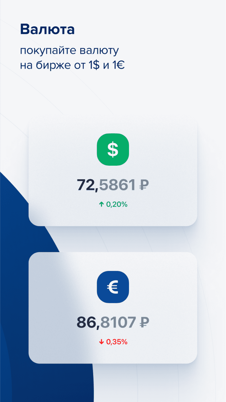 Приложение предлагает доступ ко всем финансовым инструментам. торгуемым на Московской Бирже и позволяет отслеживать все котировки в режиме реального времени. Покупка и продажа валют, акций и прочих активов осуществляется прямо с экрана вашего мобильного телефона.