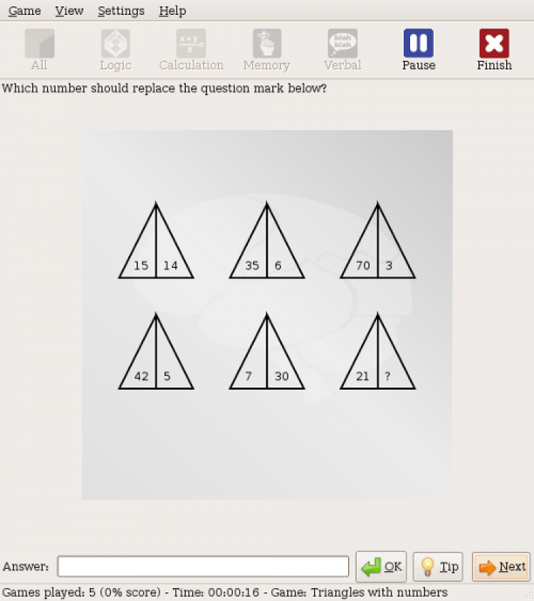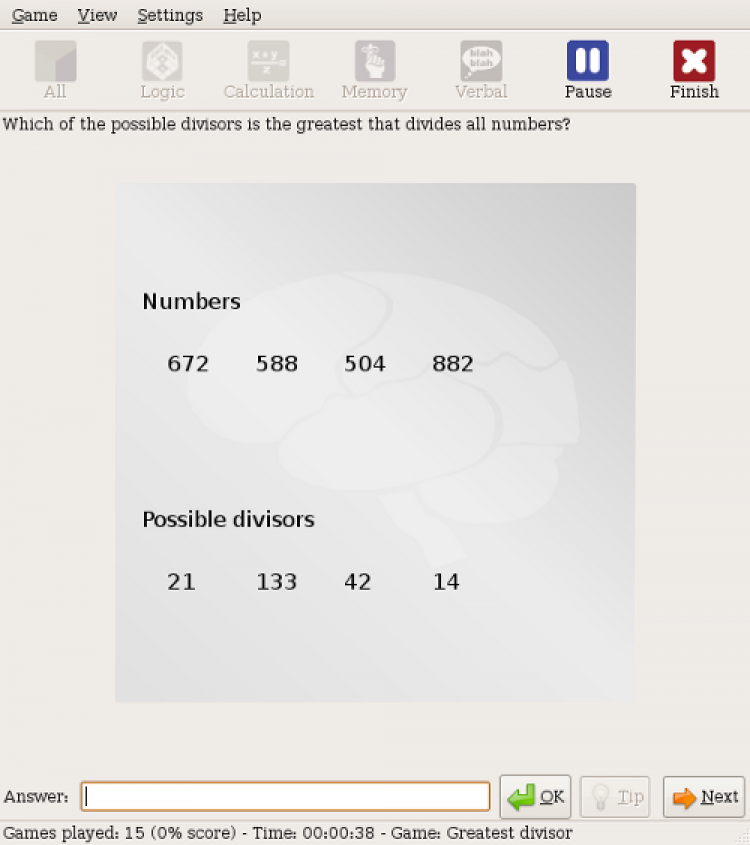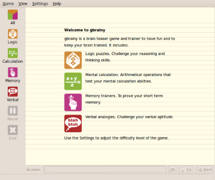 GBrainy Бесплатная игра с открытым исходным кодом, которая развивает память, внимательность и логику. Версия игры, предназначенная для Linux.