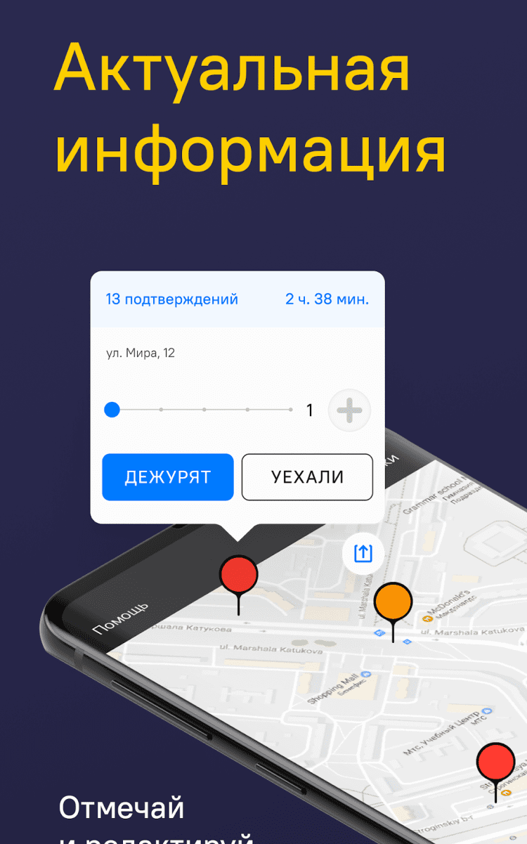 Добавить метку очень просто: достаточно нажать на большую кнопку в нижней чвасти экрана, а затем выбрать тип объекта: мед.служба, пост или рейд. При нажатии на созданную метку, вы увидите две кнопки: "подтвердить" и "уехали". С их помощью пользователи могут поддерживать актуальность информации в приложении.