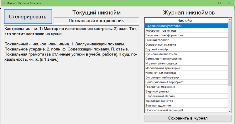Однако есть выход! Генератор случайных ников, название говорит само за себя. Оно создаёт настолько необычные словосочетания, что ник находится буквально за пару генераций! Будьте уверены, с этим небольшим приложением у вас будут самые оригинальные ники, которые только можно вообразить.