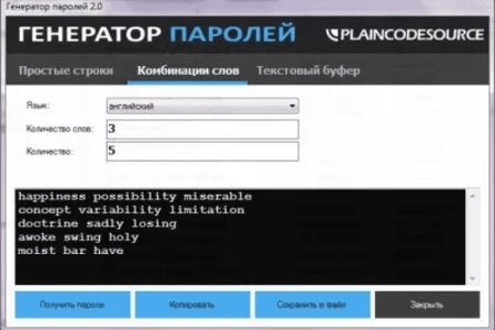 "Генератор паролей" представляет собой программу для работы с онлайновым генератором паролей plaincodesource.ws. Она позволяет генерировать до 10+ строк паролей различной длины и сложности. С помощью программы "Генератор паролей" можно генерировать пароли длиной до 128 символов. Кроме этого она позволяет создавать специальные наборы символов (номера лицензий, кредиток и пр.). "Генератор паролей" также может составлять случайные словосочетания на русском и английском языках. Пароли и словосочетания можно сохранять в текстовый файл или сразу копировать в буфер обмена Windows.